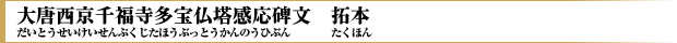 長安の龍興寺の楚金禅師(698〜759)が、長安安定坊の千福寺に多宝塔を建立した経緯を記した碑の拓本。顔真卿(709〜85)44歳壮年の作に属し、その楷書をもって書かれている。また、唐代の長安を中心とする法華経信仰についての貴重な史料としても知られる。