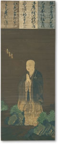 浄土教の祖師である善導(613〜81)と法然(1133〜1212)の二祖対面図。岩石や樹木が足元を飾る。善導像は下半身が金色で描かれる。添付される別紙切に「世尊寺行平筆」と見える。